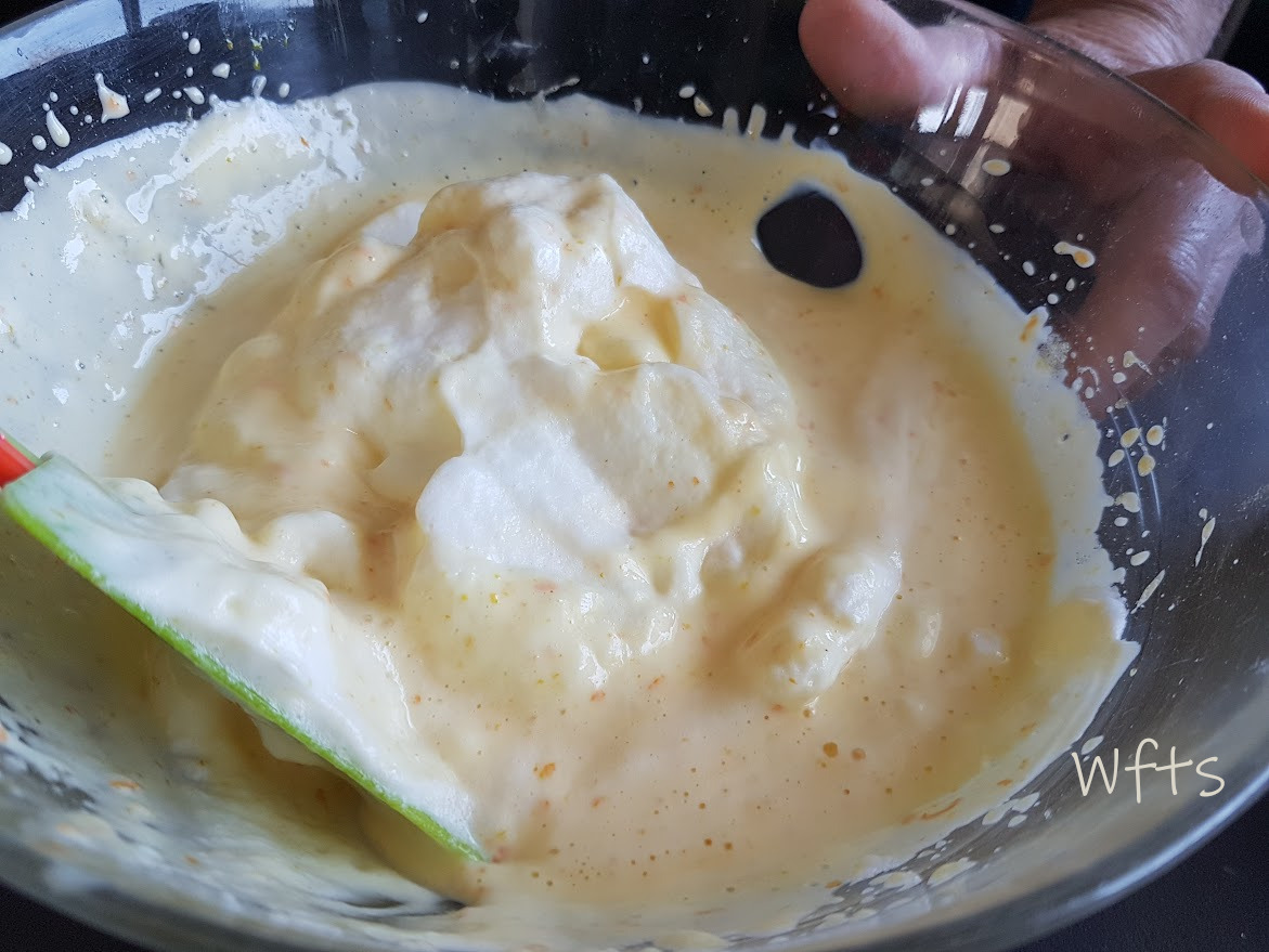Incorporer délicatement les blancs au mélange à l’orange à l’aide d’une maryse.