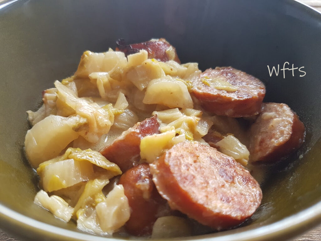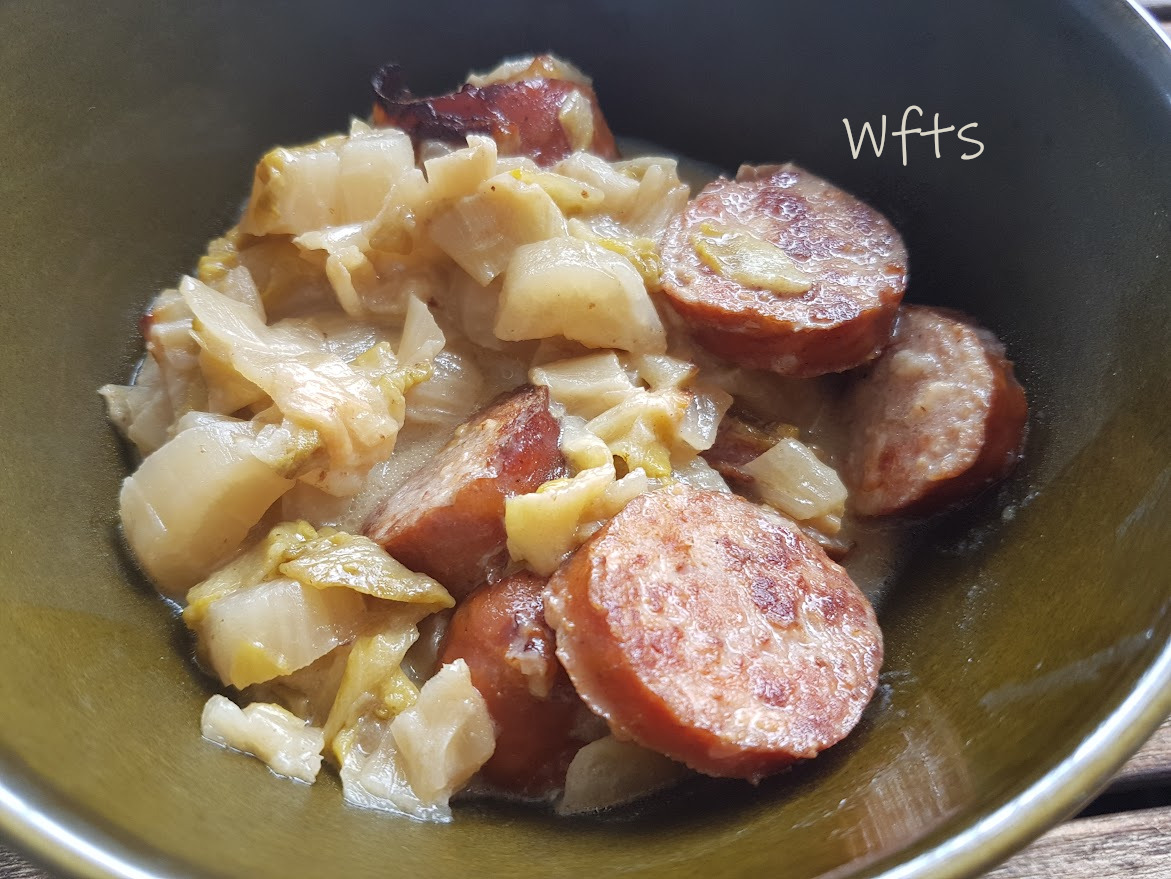 On a peu l’habitude de manger les endives cuites, du moins autrement que pour des endives gratinées au jambon. Alors forcément j’ai eu envie de tester. Les saucisses fumées trouvent souvent leur place dans notre frigo, raison de plus pour mettre cette idée au menu de la semaine.