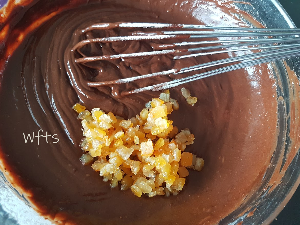 Hacher les écorces d’oranges confites au couteau. Les incorporer à la préparation.