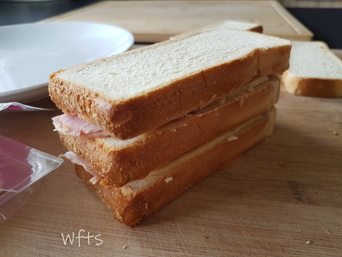 Monter les croques : une tranche de pain de mie beurré, une demi-tranche de jambon, une demi-tranche de fromage, une tranche de pain de mie beurré, une demi-tranche de jambon, une demi-tranche de fromage, et terminer par une tranche de pain de mie (non beurrée).