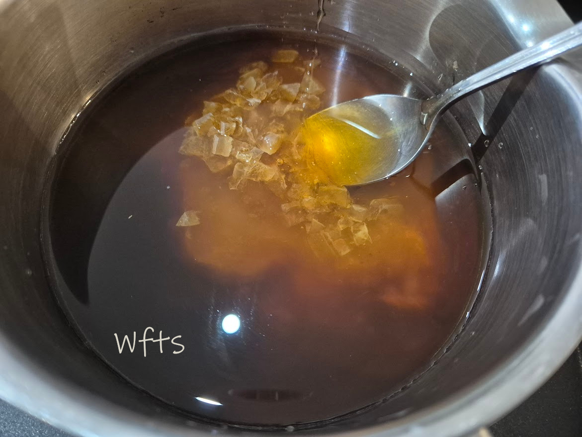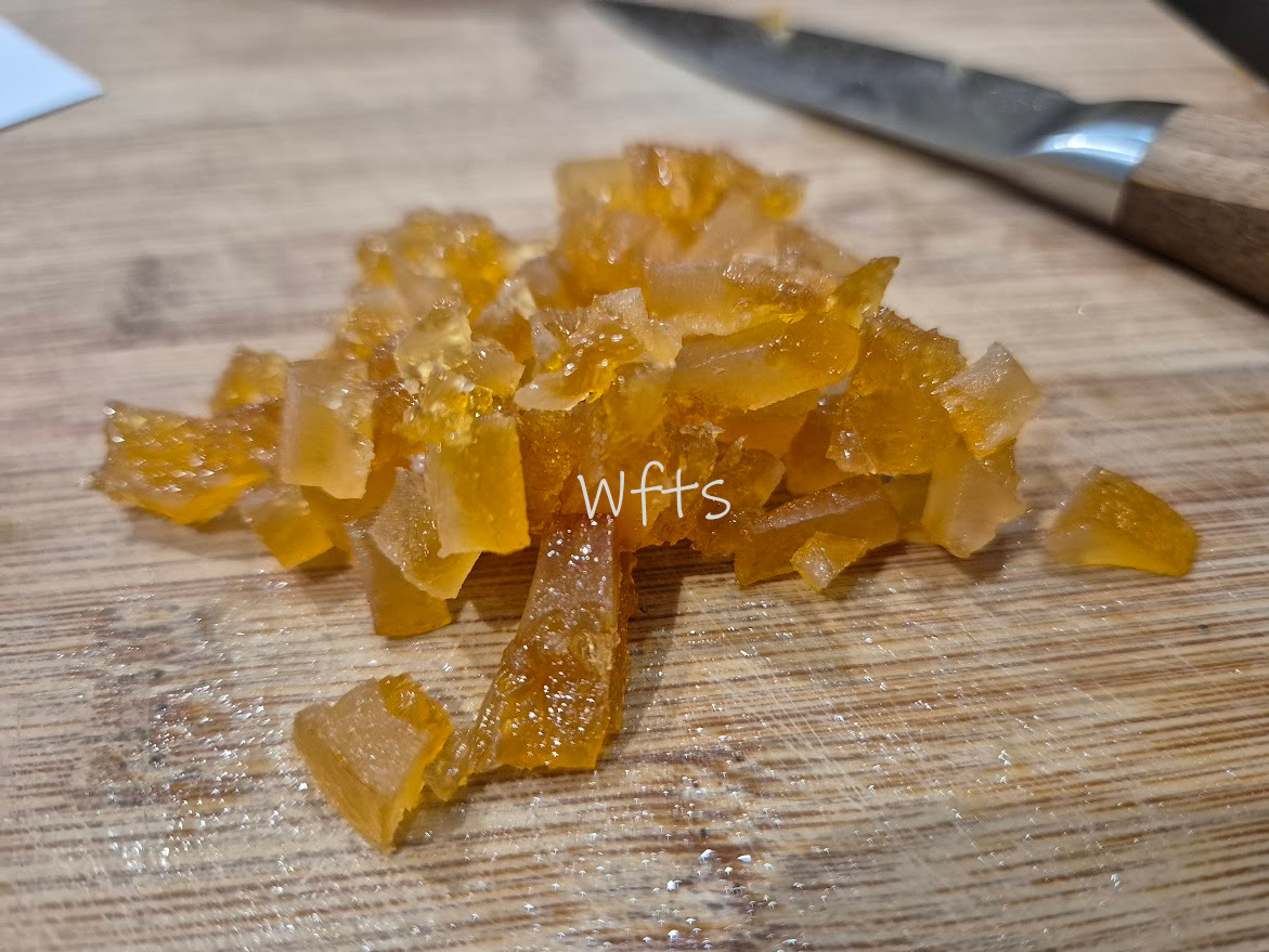 - 210 g d’eau, 20 g d’écorce d’orange confite coupé en tout petits cubes, 210 g de miel, 75 g de sucre brun complet 1 pincée de fleur de sel