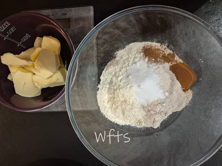 - 150 g de farine de seigle 70 g de farine T55 3/4 càc de cannelle en poudre 1/2 càc de mélange pour pain d’épices 12 g de bicarbonate de soude alimentaire, zeste d’un citron non traité