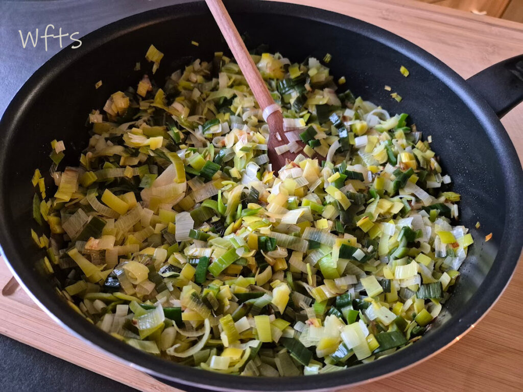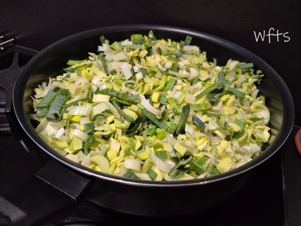 Trier des poireaux, ôter les parties sèches et les têtes, puis les émincer finement. Les laver dans une passoire. Les faire revenir dans une sauteuse avec un peu d’huile d’olive. Saler, poivrer, et réserver lorsqu’ils sont bien tendres.