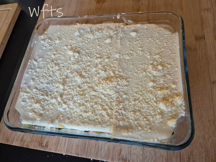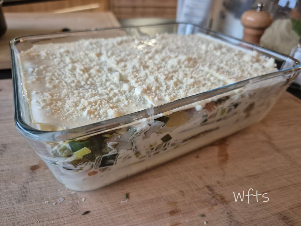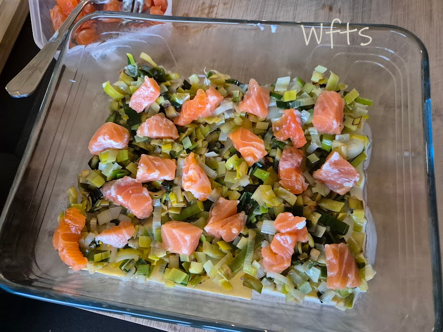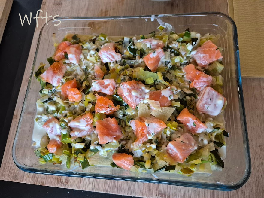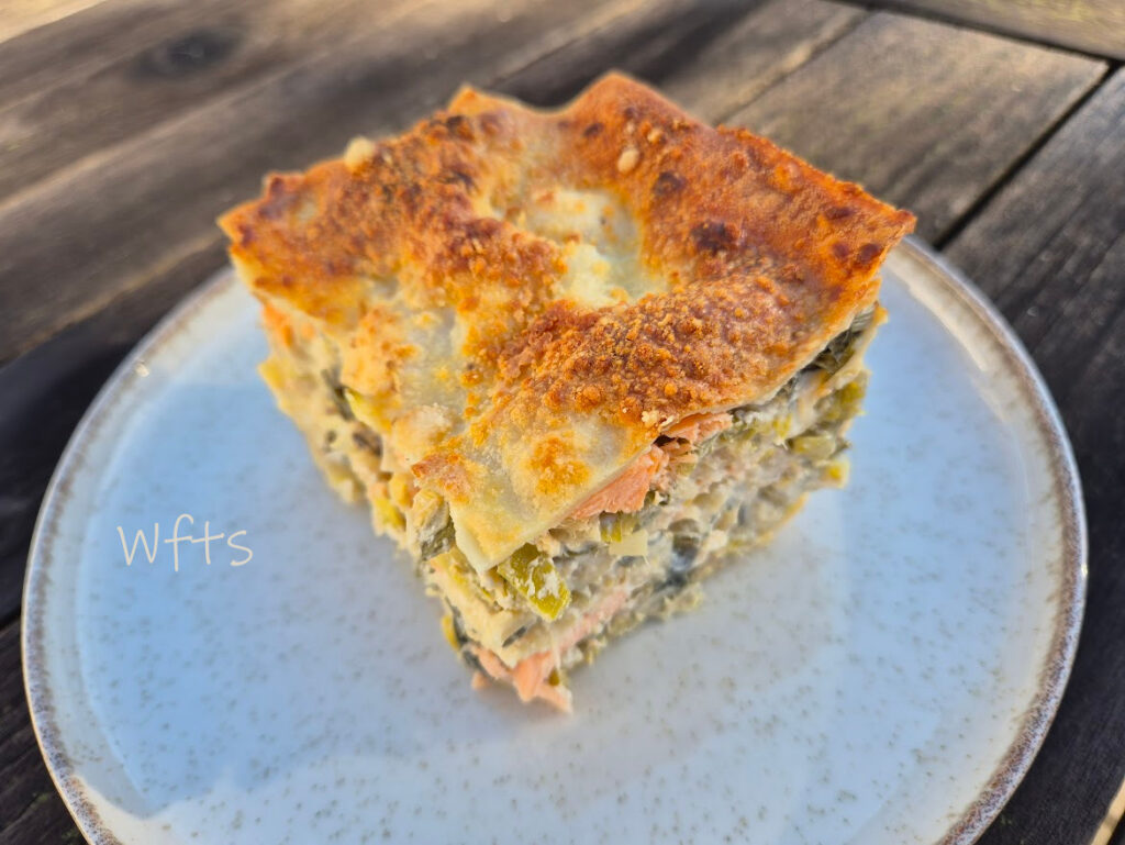 Côté préparation, un montage classique : Alternance de couches de feuilles de lasagnes sèches, poireaux cuits au préalable et saumon. Le lien ici n’est pas une béchamel mais un mélange de mascarpone, de crème et d’œufs, ce qui rend le tout très goûteux. Un temps de repos au frais pour laisser les feuilles de lasagnes bien s’imbiber, un peu de parmesan sur le dessus pour bien gratiner, et hop au four.