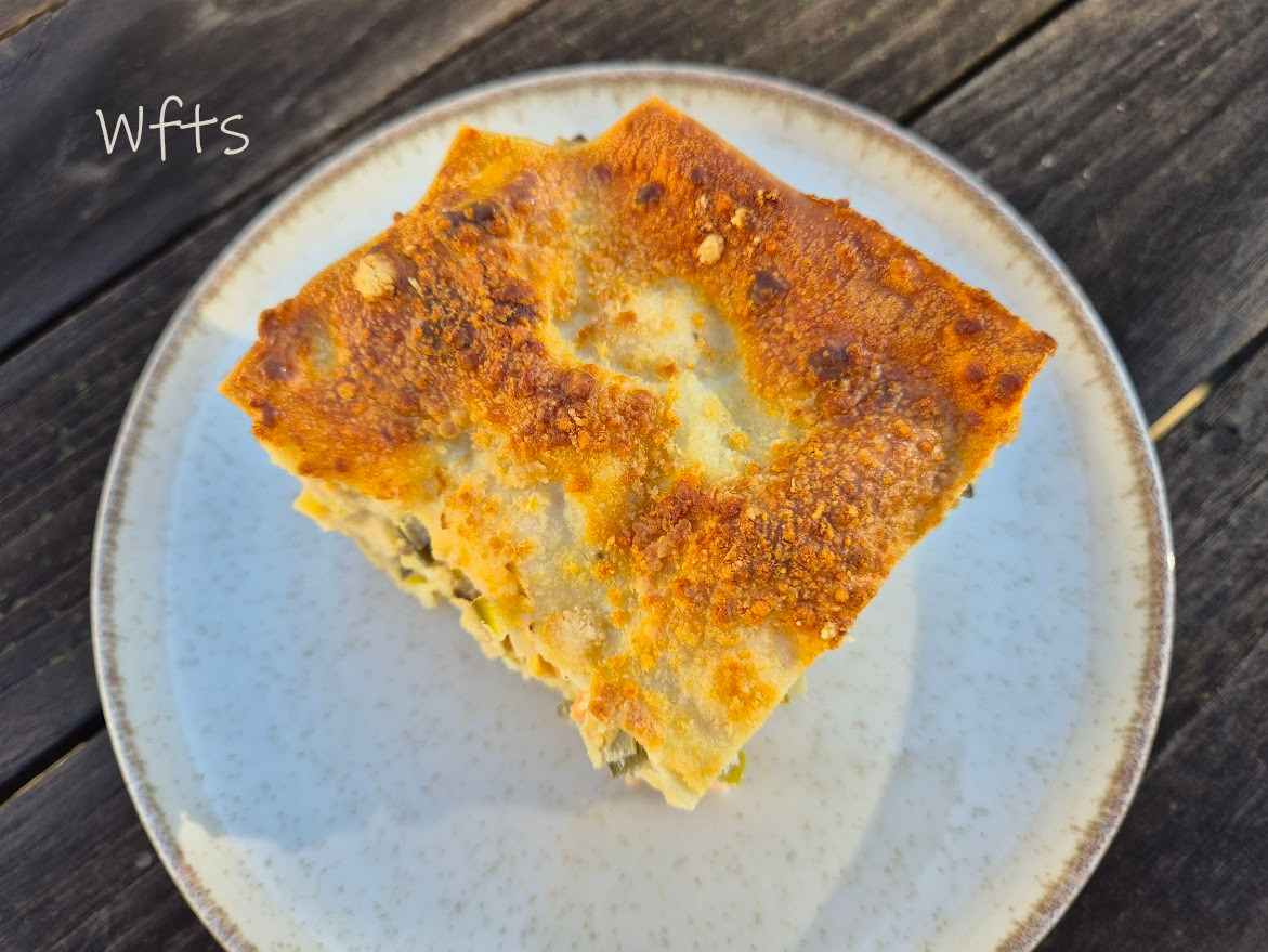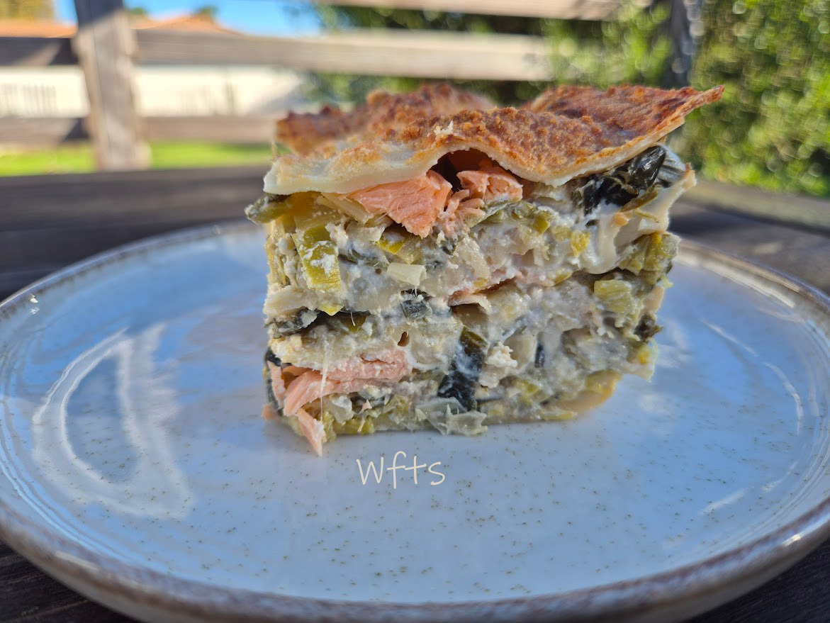 Côté préparation, un montage classique : Alternance de couches de feuilles de lasagnes sèches, poireaux cuits au préalable et saumon. Le lien ici n’est pas une béchamel mais un mélange de mascarpone, de crème et d’œufs, ce qui rend le tout très goûteux. Un temps de repos au frais pour laisser les feuilles de lasagnes bien s’imbiber, un peu de parmesan sur le dessus pour bien gratiner, et hop au four.