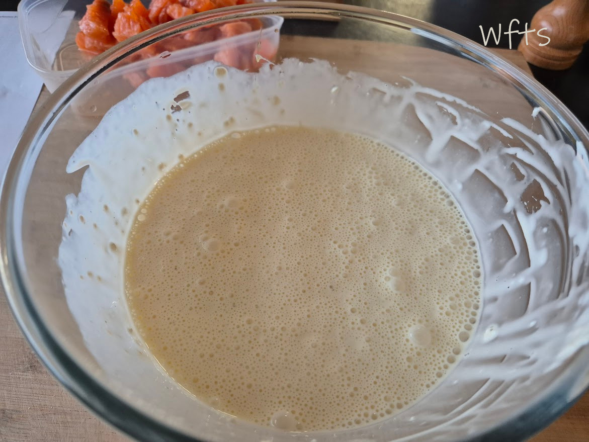 Dans un saladier, mélanger au fouet les œufs, le mascarpone, la crème, un peu de sel et de poivre.
