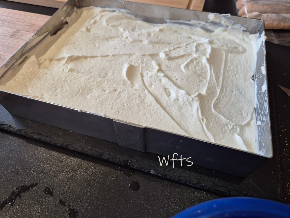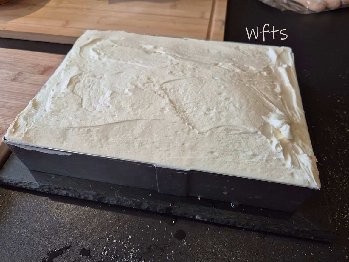 Recouvrir avec le reste de biscuits que l’on aura imbibés également, puis avec le reste de crème.