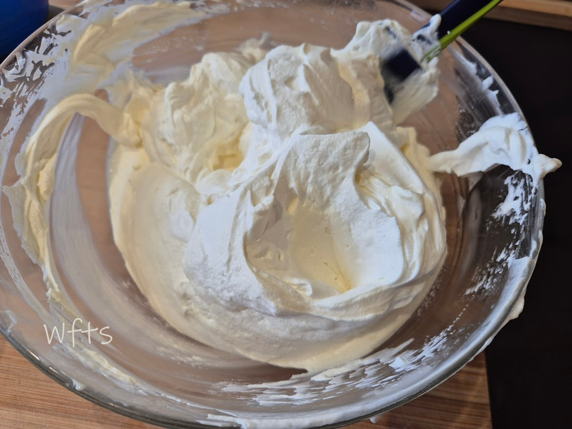 Monter la crème bien froide au batteur en chantilly. Fouetter également le mascarpone avec le lait concentré sucré pendant minute pour obtenir une crème ferme. Y ajouter la chantilly à l’aide d’une spatule.