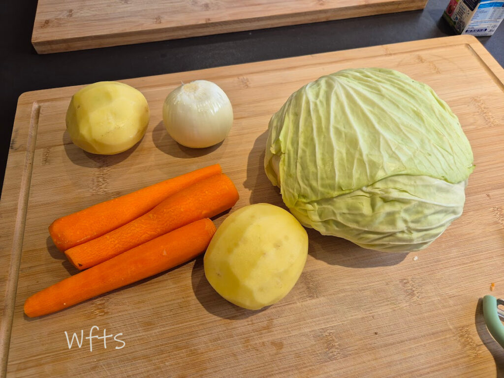 Le jour même, préparer les légumes : Peler l’oignon, les pommes de terre et les carottes, nettoyer le poireau et l’émincer. Couper le chou en lanières fines. Émincer l’oignon, couper les pommes de terre et les carottes en cubes pas trop gros.