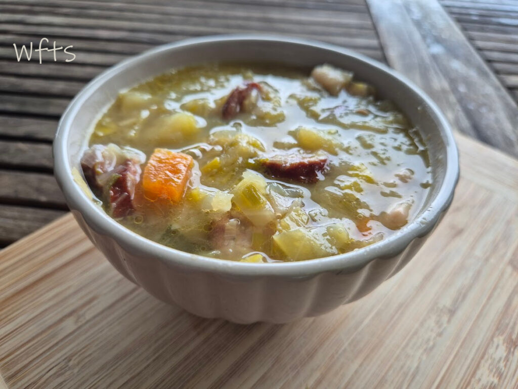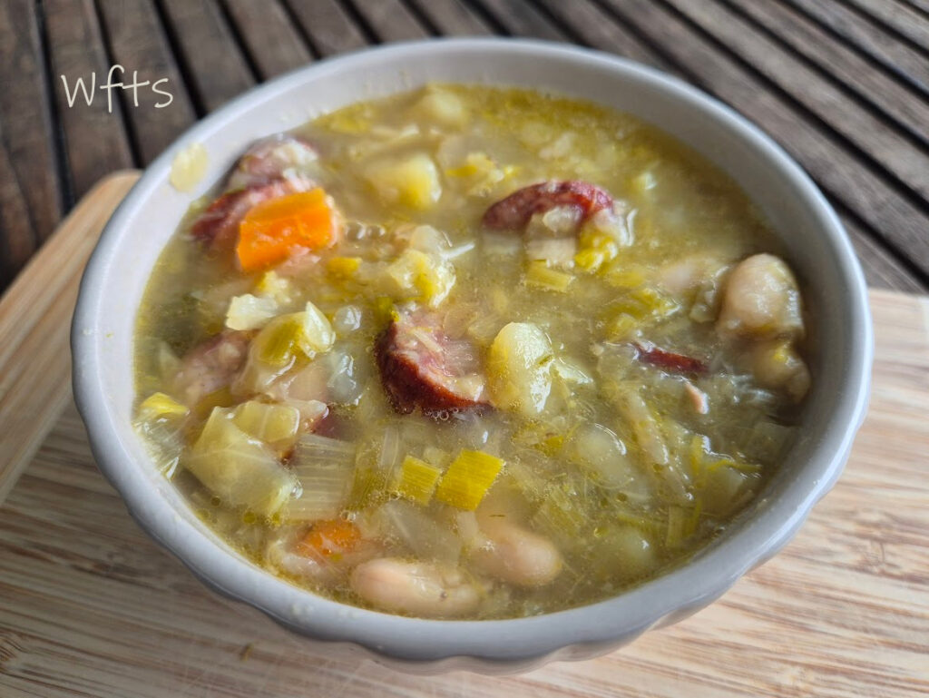 Voici la soupe qui a remporté le palmarès cet hiver chez nous, sur la carte de nos menus plusieurs fois. Si elle a été si populaire, c’est parce qu’elle contenait tout ce que l’on aimait : saucisses fumées, légumes adorés cuits dans le bouillon avec les saucisses et haricots blancs.
