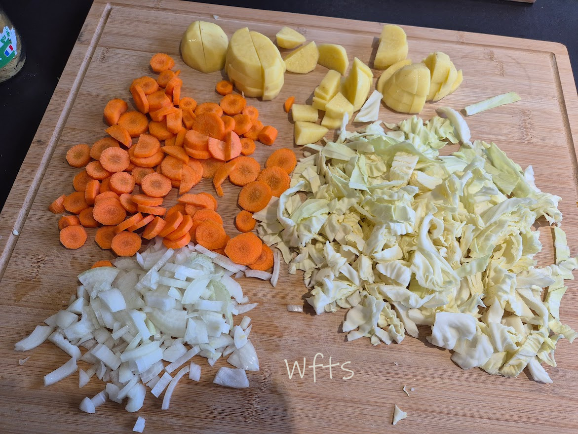 Le jour même, préparer les légumes : Peler l’oignon, les pommes de terre et les carottes, nettoyer le poireau et l’émincer. Couper le chou en lanières fines. Émincer l’oignon, couper les pommes de terre et les carottes en cubes pas trop gros.