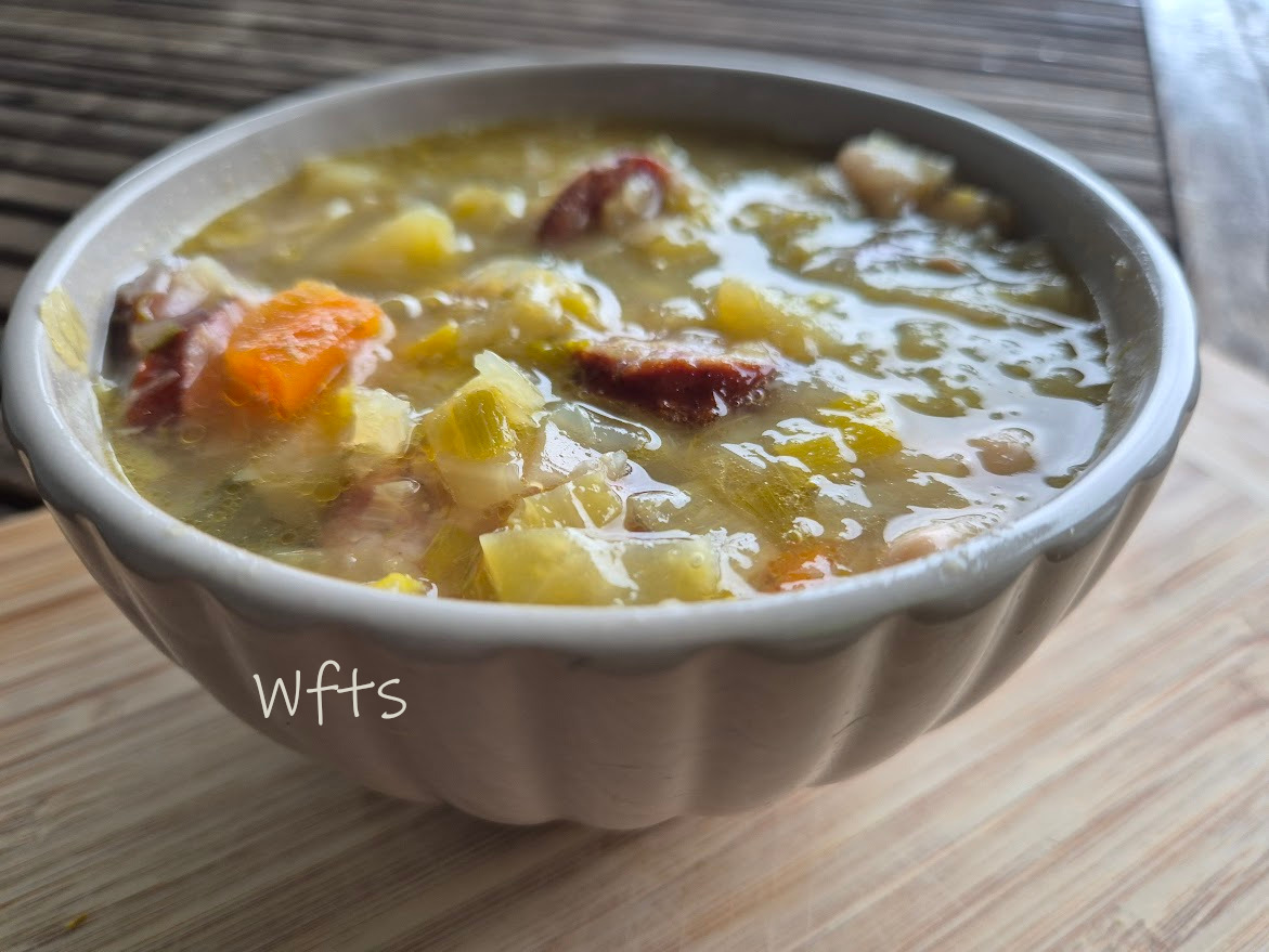 Voici la soupe qui a remporté le palmarès cet hiver chez nous, sur la carte de nos menus plusieurs fois. Si elle a été si populaire, c’est parce qu’elle contenait tout ce que l’on aimait : saucisses fumées, légumes adorés cuits dans le bouillon avec les saucisses et haricots blancs.