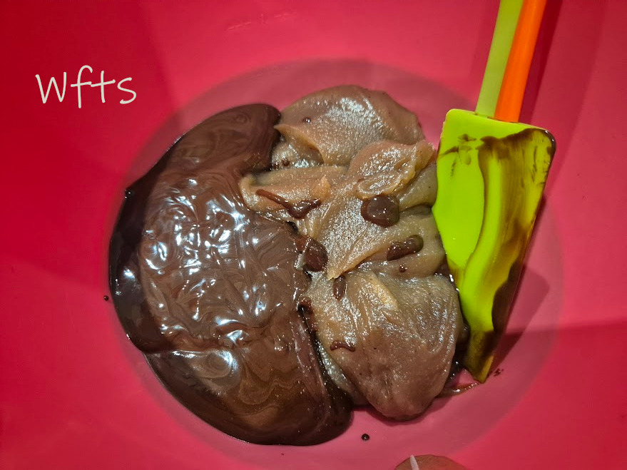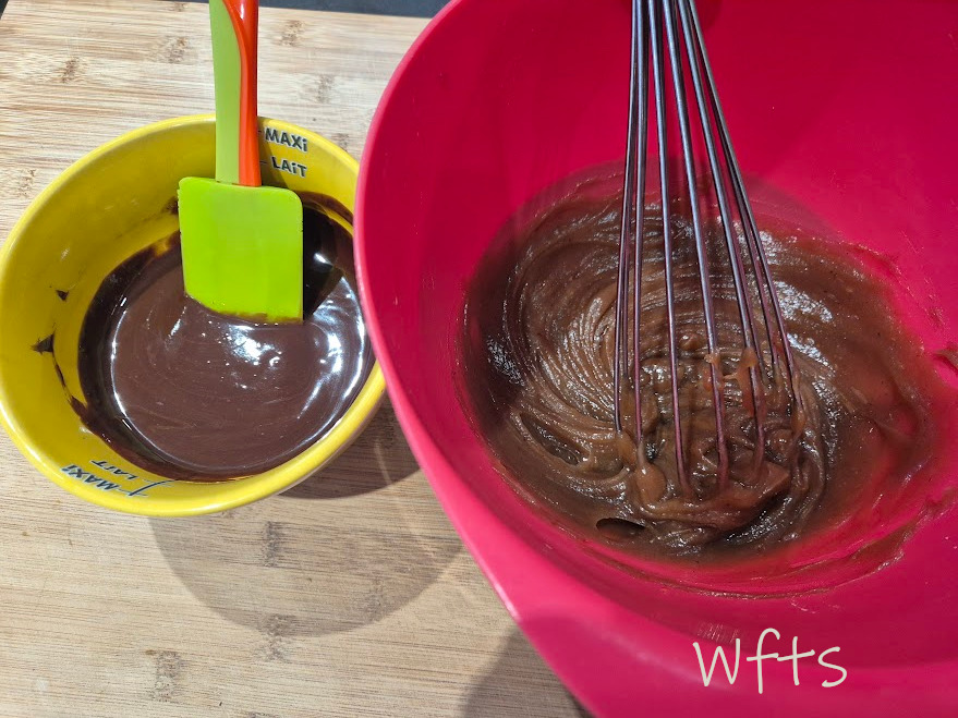 Faire fondre beurre et chocolat sur feu doux ou au micro-ondes, bien mélanger et lisser.