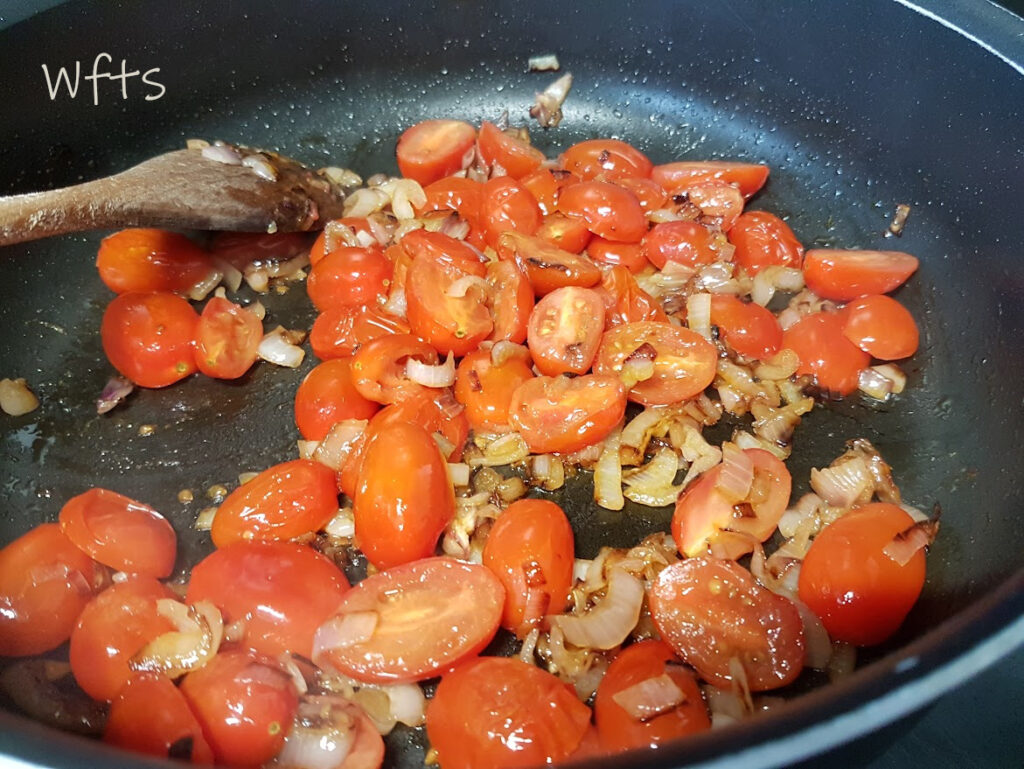 Couper les tomates en deux et les ajouter dans la sauteuse. Les faire revenir quelques minutes, le temps qu’elles réduisent un peu en purée.