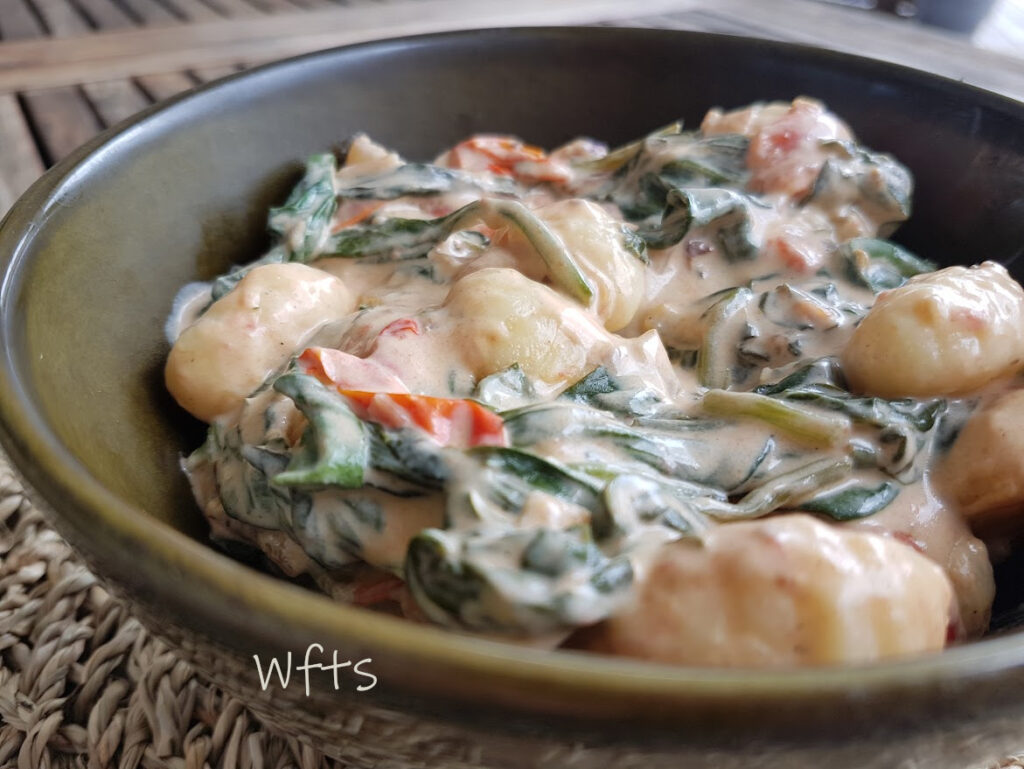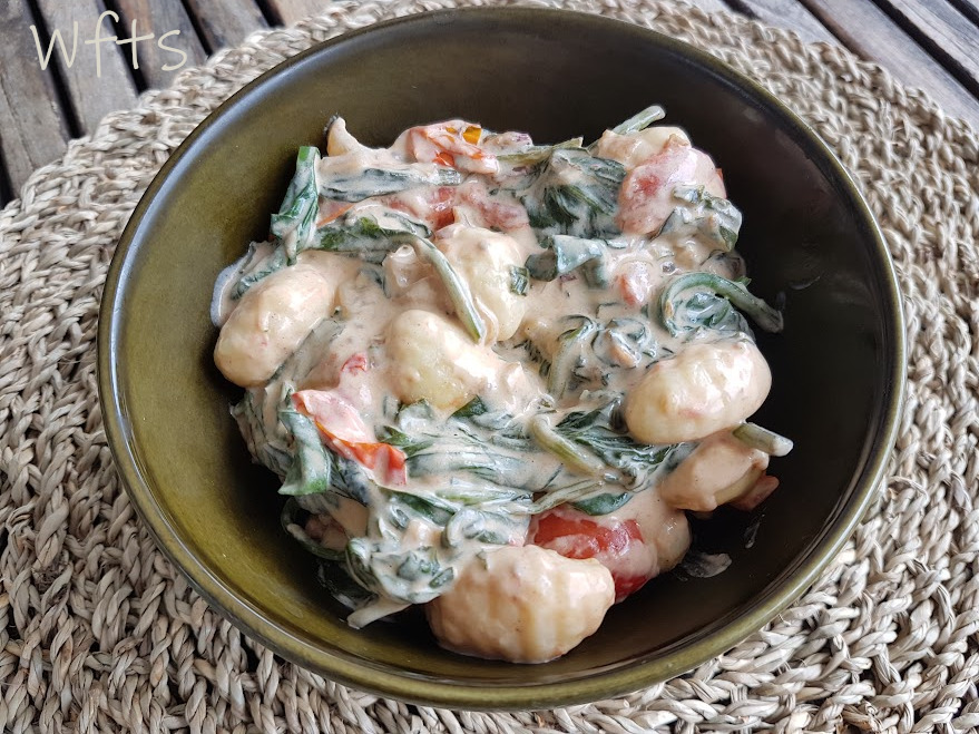 Verser sur cette sauce les gnocchis Remplir à moitié la boîte de fromage frais avec de l’eau et la verser dans la sauteuse pour diluer un peu la sauce. Bien remuer.
