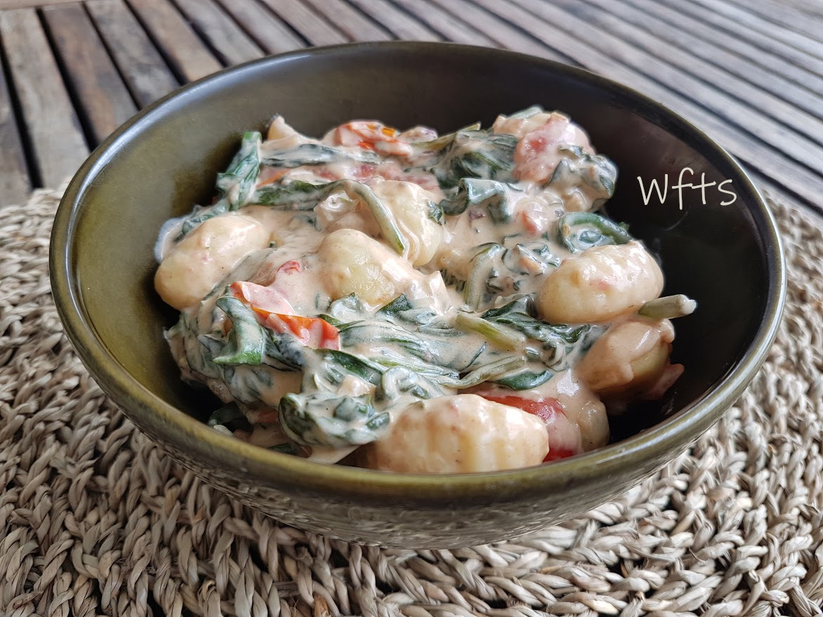 Verser sur cette sauce les gnocchis Remplir à moitié la boîte de fromage frais avec de l’eau et la verser dans la sauteuse pour diluer un peu la sauce. Bien remuer.