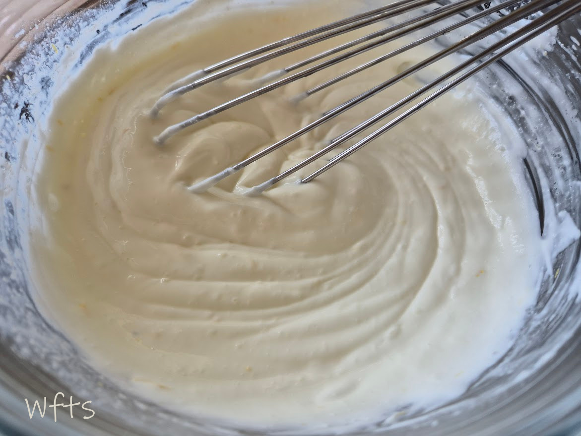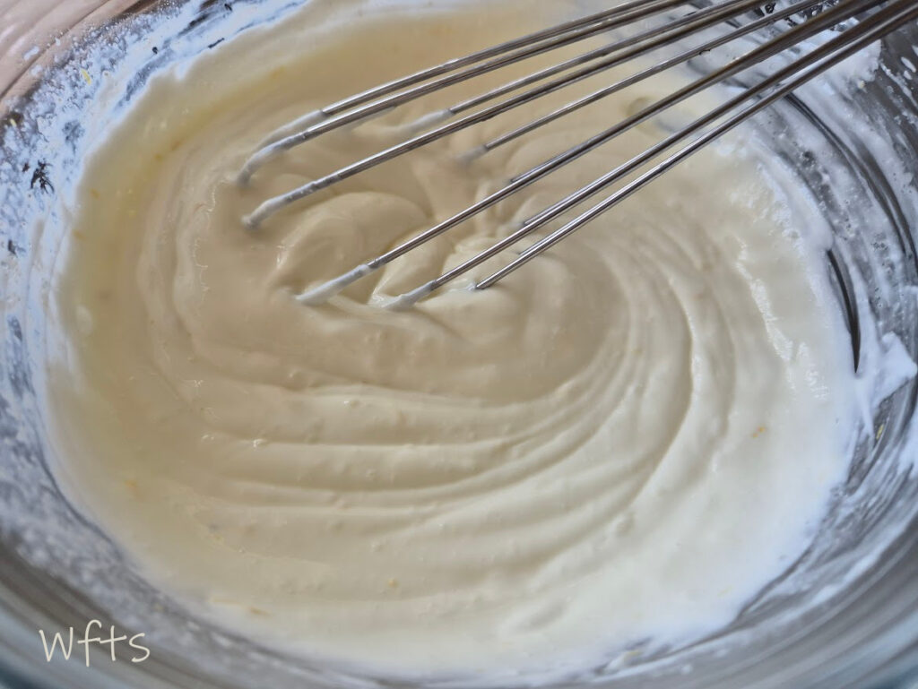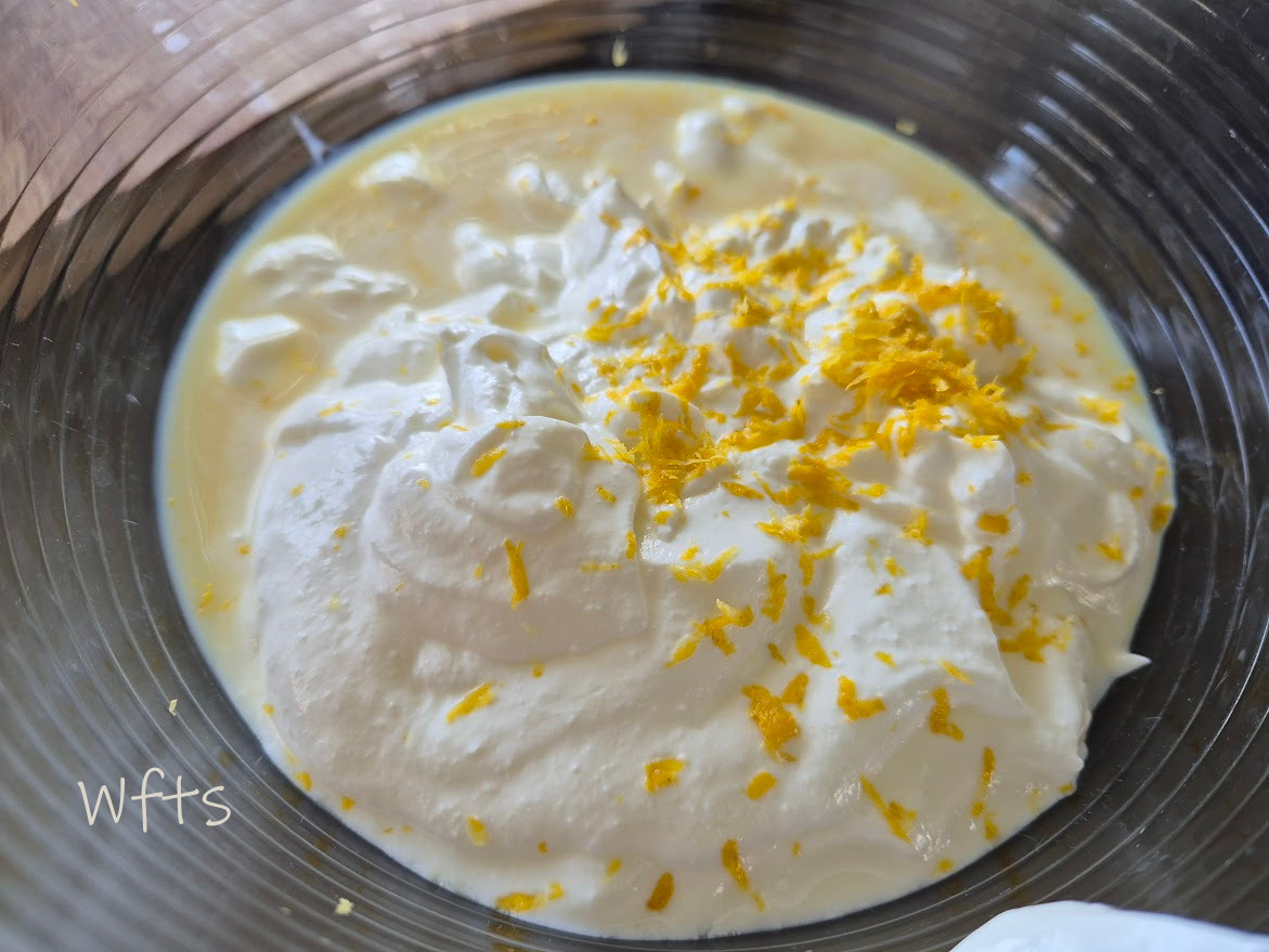 Dans un grand saladier, mélanger au fouet le yaourt, le lait concentré sucré, la moitié du zeste de citron et le jus filtré d’un demi-citron.