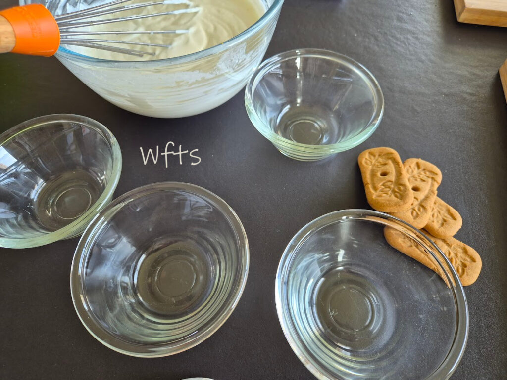 Répartir dans 4 ramequins. Enfoncer dans chacun les spéculoos. Réserver au frais au moins 3h (une nuit c’est encore mieux).